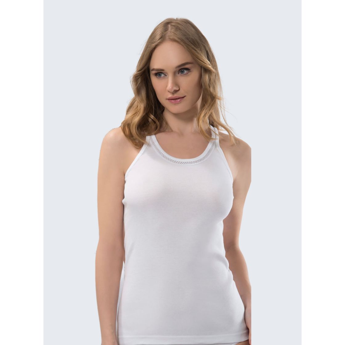 Dört mevsim cildinize nefes aldıran kumaşıyla, kadınların ihtiyaç listesinin en başında gelen, kaşkorse pamuklu kumaşıyla her vücut formuna rahatlık sağlayan dantel şeritli ince askılı, u yaka, kaşkorse, slim fit modeliyle en çok tercih edilen parçasıdır.