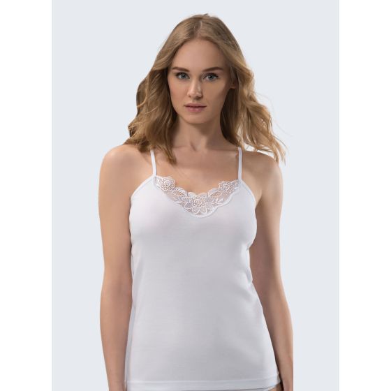 Her kadının dolabında olması gereken ve her üst giyime uyum sağlayan pamuk dantel şerit detayıyla Güpür Detaylı İp Askılı Kaşkorse Pamuklu Atlet.